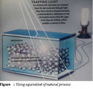 Recently, research labs across the world had started using the natural photosynthesis process to convert the solar radiation into chemical energy and then to electrical energy. It has been shown that how easy it is to generate electricity by putting a glass slide, with titanium dioxide paste (power used in toothpaste!) on it and a few drops of red hibiscus tea and electrolyte solution, in the sun along with another glass slide coated with graphite (known as Gratzel Cell).